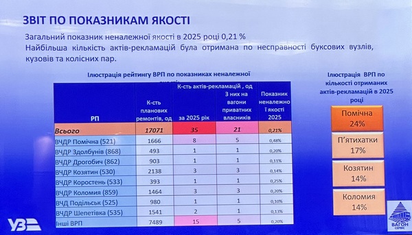- 16.09.2025 о 13:00 відбулась відкрита зустріч з власниками (представниками власників) вантажних вагонів для обговорення питань якості ремонту вантажних вагонів на підприємствах АТ «Укрзалізниця», а також процесу автоматизованого розподілу вагонів у ремонт Філією «УЗ Вагон-сервіс» (далі УЗВС).