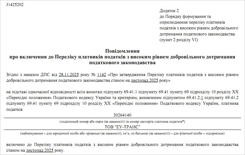 З гордістю повідомляємо, що відповідно до наказу Державної податкової служби України від 28 листопада 2025 року № 1142, ТОВ «ЕУ-ТРАНС» повторно включено до Переліку платників податків з високим рівнем добровільного дотримання податкового законодавства.