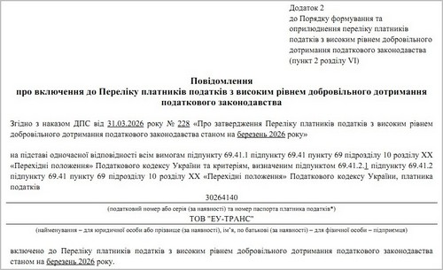 З гордістю повідомляємо, що відповідно до наказу Державної податкової служби України від 31.03.2026 року № 228, ТОВ «ЕУ-ТРАНС» знову включено до Переліку платників податків з високим рівнем добровільного дотримання податкового законодавства.